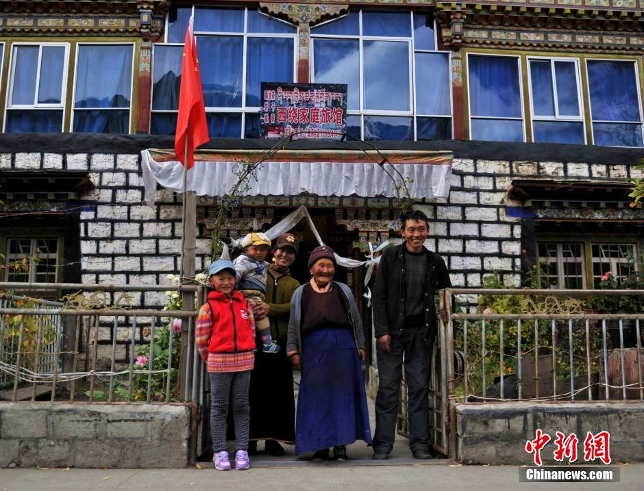 全长2146公里的318川藏公路通车60年来,每年都有成千上万的人们通过徒步、骑行、自驾等形式前往西藏拉萨。同时,还有一些人为了这条道路的畅通,长年奋战在川藏公路上,甚至献出了自己宝贵的生命。图为位于318川藏线西藏林芝段公路边开家庭旅馆主人玉珍家的全家福。 中新社发 刘忠俊 摄