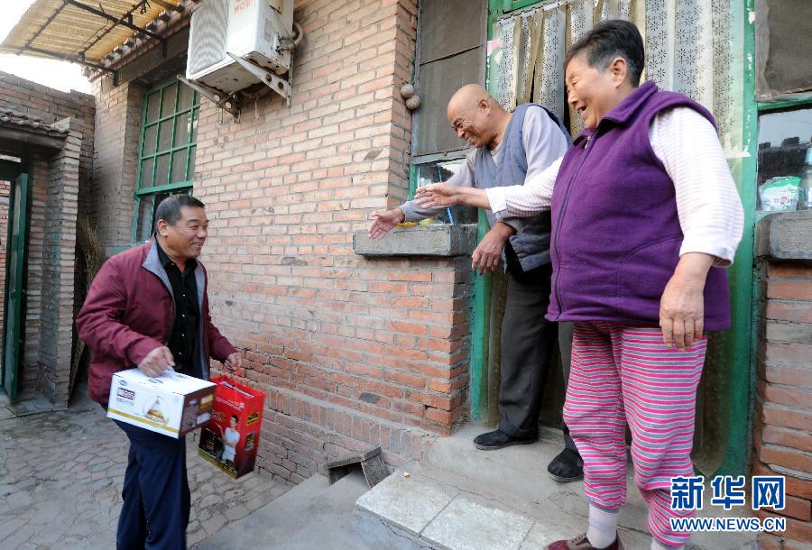 10月21日,河北大城县农民李海昌(左)看望孤老户李宝福夫妇。 59岁的河北大城县农民李海昌幼年家庭贫困,曾多次获得邻里乡亲的帮助,长大后下海经商的他不但带领全家人摆脱了贫困,更没忘记儿时左邻右舍给予的关爱。从1986年以来,他一直对村里孤寡老人和病残者提供帮扶和资助,同时还和家人一起在日常生活中为他们排忧解难。近日在中央文明办发布的2014年9月“中国好人榜”上,大城县李海昌当选为该月助人为乐好人。新华社记者 李晓果摄
