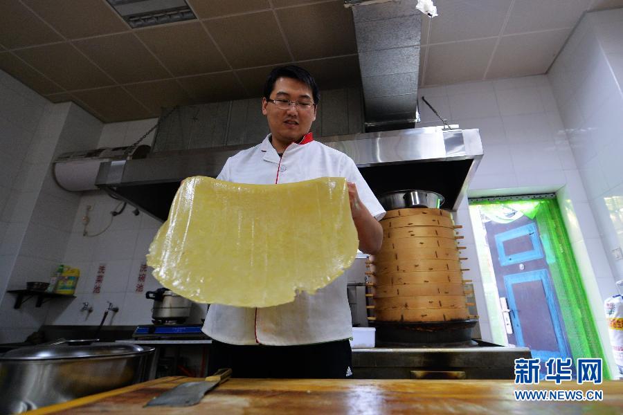 10月21日,杨洋拿起一张刚刚制作好的酿皮准备分切。从海外企业白领到酿皮小吃店老板,“80后”的海归硕士杨洋在兰州当地的一条小吃街上完成了自己的职业转变。1984年出生的杨洋曾在俄罗斯学习、工作和生活了11年,2012年底,他回到兰州,决定依照儿时记忆中的味道,将卖酿皮和甜醅子等兰州特色小吃作为自己的创业方向。他聘请了专门的酿皮师傅并拜师学艺,在兰州一条著名的小吃街上开起酿皮店。创业几个月来,小吃店一天能收入六七千元,已经有了不少回头客。杨洋希望大家能在自己店里感受到最本土的味道,同时把兰州的当地小吃文化弘扬到更多地方。新华社记者 陈斌 摄