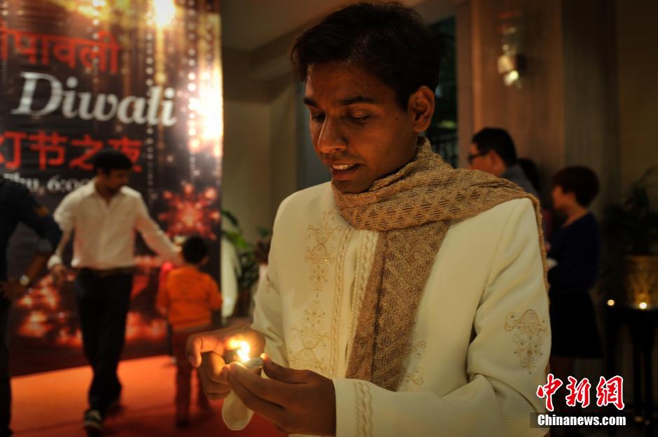 10月23日,一名印度民众在点蜡烛。当日是秋末的最后一个节气,意味着天气转凉、寒霜初现,这天也是印度传统的“排灯节”,10多位来自印度、尼泊尔等地的印度教徒和近百名昆明市民一起载歌载舞迎接节日的到来。排灯节,又称万灯节、印度灯节或者屠妖节,是印度教、锡克教和耆那教“以光明驱走黑暗,以善良战胜邪恶”的节日。中新社发 刘冉阳 摄