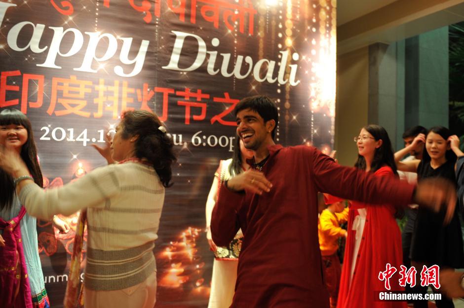 10月23日,中印两国民众载歌载舞庆佳节。当日是秋末的最后一个节气,意味着天气转凉、寒霜初现,这天也是印度传统的“排灯节”,10多位来自印度、尼泊尔等地的印度教徒和近百名昆明市民一起载歌载舞迎接节日的到来。排灯节,又称万灯节、印度灯节或者屠妖节,是印度教、锡克教和耆那教“以光明驱走黑暗,以善良战胜邪恶”的节日。中新社发 刘冉阳 摄