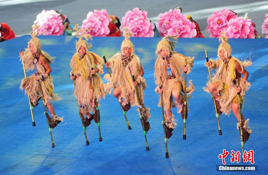 10月23日,湖南省第八届少数民族传统体育运动会在岳阳开幕。3000余名少数民族同胞身着华丽服饰亮相,为观众上演了一场独特的民俗文化盛宴。图为湘西州代表团的土家族茅古斯表演。 杨华峰 摄