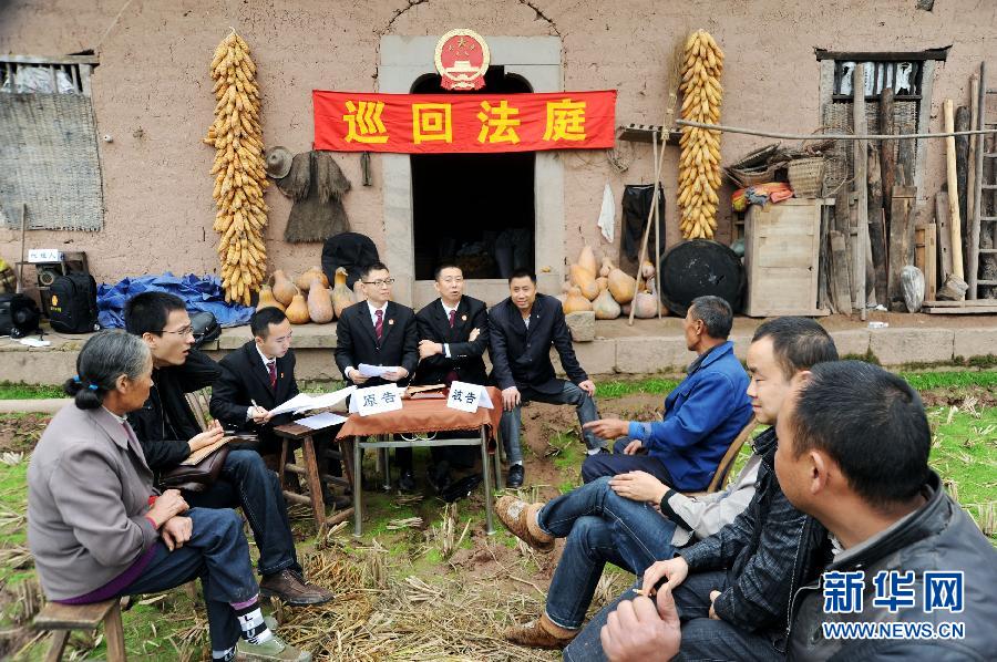 在云阳县石门乡广益村,法官在农家门前为村民处理家庭纠纷(2013年11月8日摄)。重庆市云阳县地处三峡库区中部,大巴山腹地,全县137万人口中40万人常年在外务工。在大库区、大山区、大农村的独特县情下,司法如何贴近群众,保障民生,成为当地法院面临的严峻考验。自2009年以来,云阳县人民法院秉承司法为民理念,在辖区大力推行便民诉讼和巡回审判。通过构建“庭、站、点、员”和培养“院坝法官、田坎法官、草帽法官”,不但就地化解了民事纷争,解决了群众的烦心事儿,还在村民中普及了法律知识,播种了法治意识。 5年多来,该院法官巡回办案行程上万公里,在乡镇、街道、社区、院坝审理各类民事纠纷2900余件,成为一道播种法治思想,维护民生和谐的“流动风景线”。新华社发(饶国君 摄)