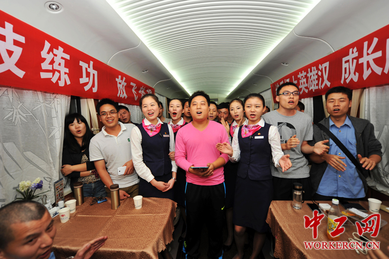 图为在列车上优秀选手们和列车工作人员开展联欢活动、一曲情歌对唱《知心爱人》让现场气氛达到高潮。