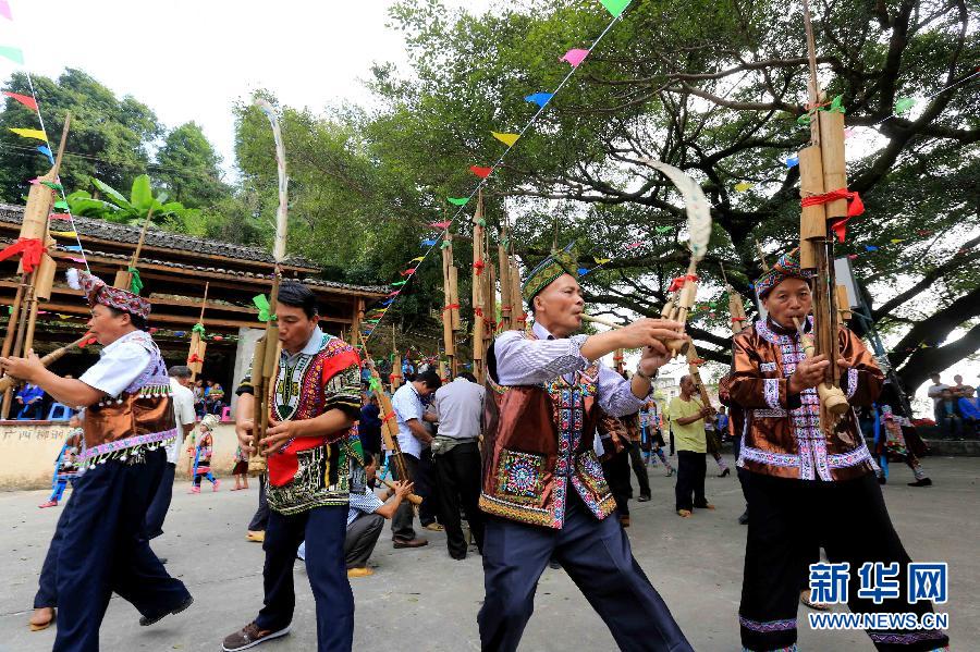 10月26日,在广西柳州市融水苗族自治县香粉乡雨梅苗寨,苗家汉子在“打同年”上吹奏芦笙。 当日,广西柳州市融水县香粉乡卜令村到雨梅村 “打同年”。“打同年”是融水苗族村寨的一种民俗,即友好村寨之间的拜年联欢活动。双方约定,一方向对方发出邀请,另一方则每家派出代表组成“打同年”队伍,由族老带队,吹着芦笙到主方村寨拜年。后来逐渐演化为苗、瑶、侗等少数民族村寨之间联欢的活动,当地俗称“打老庚”,意为交朋友、结兄弟。现在已发展成为多民族的集体交流活动。新华社发(谭凯兴 摄)
