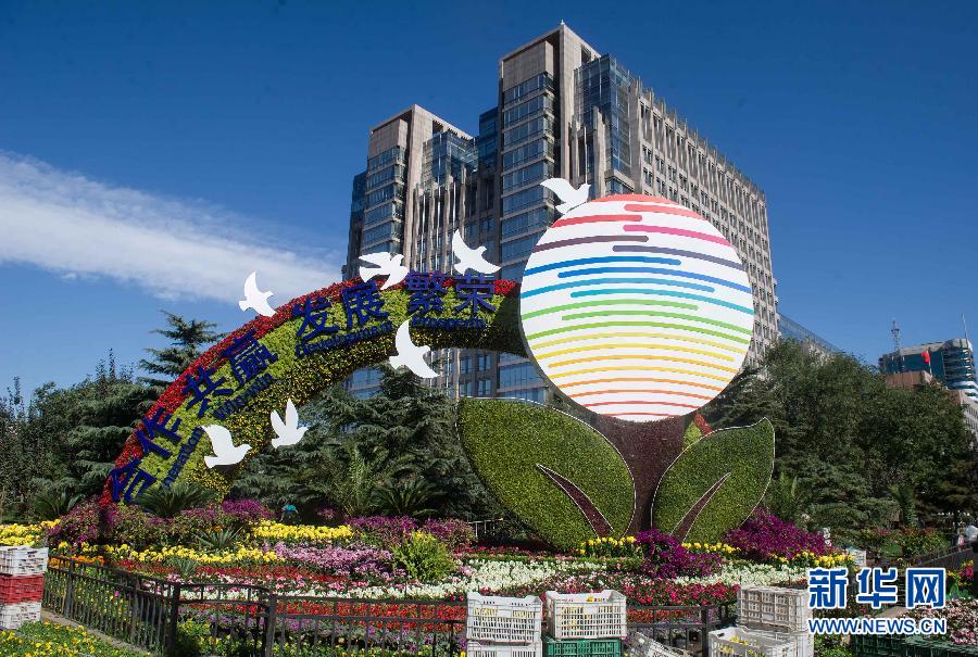 北京市长安街东单路口即将布置完成的亚太经济合作组织(APEC)主题花坛(10月26日摄)。近日,以迎接APEC会议为主题的花坛在北京东单亮相,为秋季北京增添一抹美丽的风景。2014年11月5日至11日,亚太经济合作组织(APEC)领导人会议周各项活动将在北京举行。新华社记者 罗晓光 摄