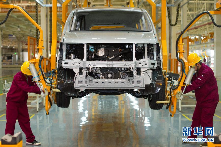 10月28日,江淮汽车蒙城基地工作人员在生产线上为汽车安装轮胎。当日,位于安徽北部蒙城县的江淮安驰汽车新基地落成并投入使用。据了解,该汽车生产基地总投资13.6亿元,占地面积841亩,投产后将形成年产15万辆汽车、近120亿元年产值的规模。新华社记者杜宇摄