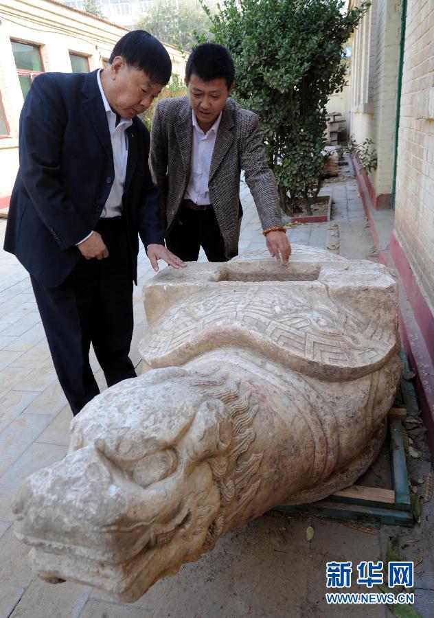 10月28日,河北霸州市文物所工作人员在对赑屃进行考察研究。近日,河北霸州市信安镇一户村民在家中挖土时,意外发现一尊赑屃。经当地文物管理处工作人员鉴定,这尊赑屃可能为金代万佛寺遗物,距今约有800年。经测量,赑屃全长约1.6米,宽约1.3米,高约0.4米,重约2吨。赑屃是传说中龙的九子之一,外形似龟,力大无穷,好负重。在宫殿、祠堂、显赫陵墓等处,常见其背负石碑的形象。据文物管理处工作人员介绍,文物出土地为金代万佛寺遗址。新华社记者 李晓果 摄