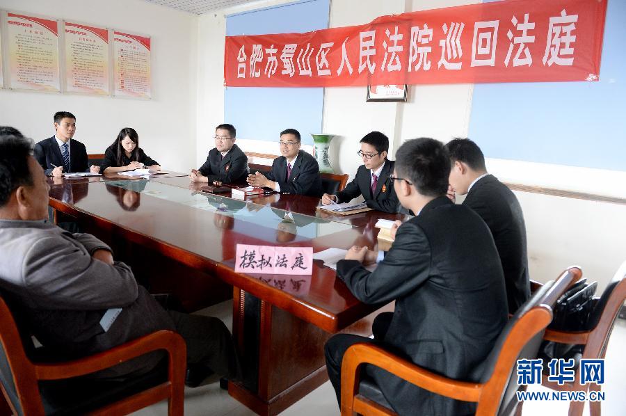 10月28日,法官、律师们在合肥市蜀山区南岗镇双塘村开展模拟法庭体验活动,让村民们近距离了解法院、律师的办公流程。多年来,安徽省合肥市蜀山区南岗镇定期为基层农民开展法官、律师免费法律援助、法治宣传以及普法教育等法律服务,向基层农民展现法治精神。新华社记者郭晨摄