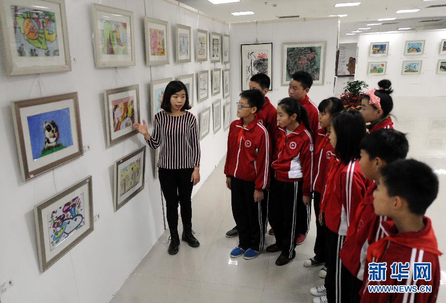 10月28日,学生们在参观中国梦美术作品展。近日,河北省霸州市举办了以“中国梦”为主题的少儿美术作品展,共展出了从该市10余所幼儿园、20家画室的近2000幅作品中筛选出来的408幅作品。该美术作品展涵盖书法、国画、水粉画、油画、丙烯画、特殊材料绘画及手工等七大类作品,充分展示了少儿丰富多彩的精神文化生活和积极向上的文化风貌,为少年儿童搭建了展示才艺、展示梦想的舞台。新华社记者 李晓果 摄