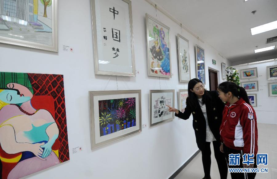 10月28日,一名家长陪同孩子参观中国梦美术作品展。近日,河北省霸州市举办了以“中国梦”为主题的少儿美术作品展,共展出了从该市10余所幼儿园、20家画室的近2000幅作品中筛选出来的408幅作品。该美术作品展涵盖书法、国画、水粉画、油画、丙烯画、特殊材料绘画及手工等七大类作品,充分展示了少儿丰富多彩的精神文化生活和积极向上的文化风貌,为少年儿童搭建了展示才艺、展示梦想的舞台。新华社记者 李晓果 摄