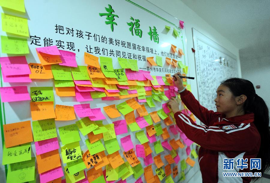 10月28日,一名学生在中国梦美术作品展的许愿墙上写下自已的愿望。近日,河北省霸州市举办了以“中国梦”为主题的少儿美术作品展,共展出了从该市10余所幼儿园、20家画室的近2000幅作品中筛选出来的408幅作品。该美术作品展涵盖书法、国画、水粉画、油画、丙烯画、特殊材料绘画及手工等七大类作品,充分展示了少儿丰富多彩的精神文化生活和积极向上的文化风貌,为少年儿童搭建了展示才艺、展示梦想的舞台。新华社记者 李晓果 摄