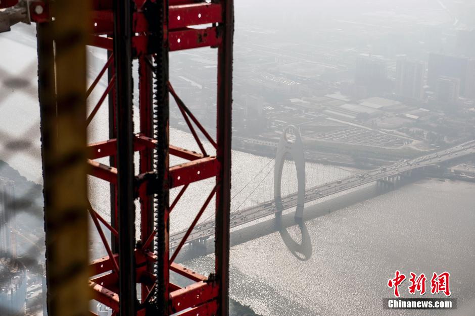 10月28日,广州周大福金融中心即东塔封顶,总高度530米,比广州原第一高楼西塔还高出近100米,刷新了广州建筑的新高度,成为名副其实的“广州第一高楼。东塔位于广州珠江新城,与已建成的西塔、广州塔构成等腰三角形,是广州新城市中轴线上地标性建筑的压轴之作。占地约2.6万平方米,总建筑面积约50万平方米,共116层,其中地上111层、地下5层。图为在东塔塔顶处俯瞰猎德大桥。 中新社发 龙宇阳 摄