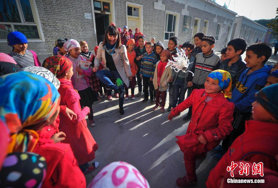 图为工作组队员玛依拉为村里的希望小学义务讲双语课,和蔼的玛依拉深得孩子们喜爱。课间时分,玛依拉和孩子们跳起了毽子。 中新社发 刘新 摄