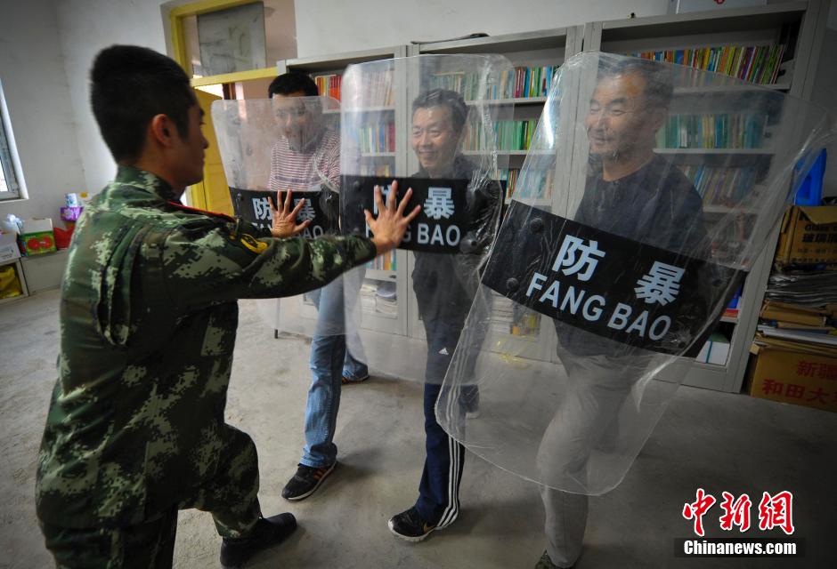 图为工作组请来武警战士为队员们讲解防护用具的使用方法。 中新社发 刘新 摄