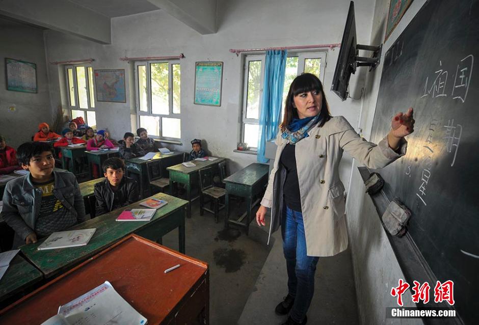 工作组队员玛依拉为村里的希望小学义务讲双语课,和蔼的玛依拉深得孩子们喜爱。 中新社发 刘新 摄