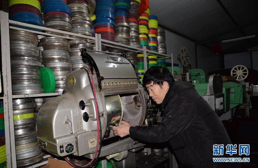 10月29日,魏少先在自家收藏室里查看他收藏的电影放映机。今年59岁的魏少先是河北省邯郸市邯郸县南吕固乡四留固村的一名农民,早些年通过创业致富。从2004年起,他开始收藏红色影片。目前,他已从全国各地收集、采购各类老电影和革命战争纪录片逾5000部。为了让更多人通过红色经典电影了解历史,2005年开始,魏少先义务为群众放电影。10年来,他在北京、天津、河北、江苏、山西、云南等省区市义务放映3000多场,受益观众达10万余人。新华社发(郝群英 摄)