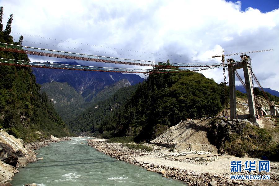 跨越通麦天险的通麦特大桥正在建设中(10月22日摄)。远处的雪山在落日余晖的映衬下巍峨壮观,举手可触的朵朵白云点缀在沁人心脾的蓝天之间,一条蜿蜒盘旋的“长龙”辗转间直上云霄深处…… 这条从成都直通拉萨、有着最美最险“天路”别称的川藏公路国道318线,全长约2095公里,沿途风景千变万化,多姿多彩,行走其中,可以体验“隔山不同天,一天有四季”的奇妙感觉。高耸巍峨的二郎山、有“摄影家走廊”之称的新都桥、妩媚动人的姊妹湖、曲折盘旋的怒江七十二拐、令人叹为观止的通麦天险……连绵的雪山、湖泊、草原、原始森林等赋予其“中国最美丽景观大道”的美誉。目前,以318国道为轴线、贯通东西的旅游通道和沿途的重点旅游观光景点已成体系,川藏公路也成为名符其实的旅游“黄金通道”。新华社记者潘旭摄