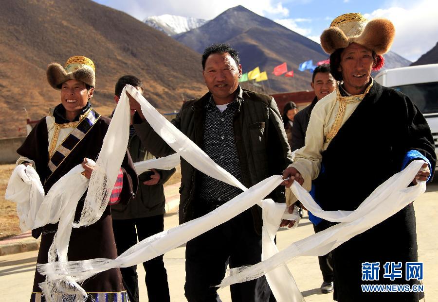西藏墨竹工卡县的藏族村民手捧哈达欢迎游客(10月23日摄)。远处的雪山在落日余晖的映衬下巍峨壮观,举手可触的朵朵白云点缀在沁人心脾的蓝天之间,一条蜿蜒盘旋的“长龙”辗转间直上云霄深处…… 这条从成都直通拉萨、有着最美最险“天路”别称的川藏公路国道318线,全长约2095公里,沿途风景千变万化,多姿多彩,行走其中,可以体验“隔山不同天,一天有四季”的奇妙感觉。高耸巍峨的二郎山、有“摄影家走廊”之称的新都桥、妩媚动人的姊妹湖、曲折盘旋的怒江七十二拐、令人叹为观止的通麦天险……连绵的雪山、湖泊、草原、原始森林等赋予其“中国最美丽景观大道”的美誉。目前,以318国道为轴线、贯通东西的旅游通道和沿途的重点旅游观光景点已成体系,川藏公路也成为名符其实的旅游“黄金通道”。新华社记者潘旭摄