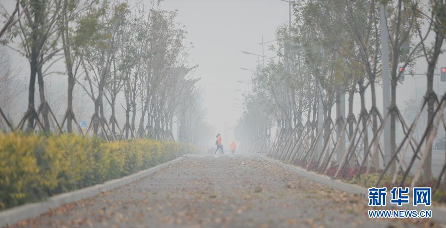 10月31日,市民行走在雾霾笼罩的路上。当日,沈阳市区遭遇了入秋以来最严重的雾霾和空气污染天气。辽宁省气象台31日凌晨发布雾霾橙色预警,沈阳市内多个监测点空气污染指数已经达到监测峰值500,其他未达到峰值的监测点在400指数以上,到达重度污染级别。新华社记者 姚剑锋 摄