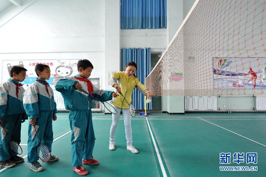 10月30日,在宁夏石嘴山市大武口区星海小学,孩子们在乡村少年宫内学习打羽毛球。近年来,为了丰富农村孩子的课余生活,提高农村娃第二课堂的质量,宁夏回族自治区石嘴山市在全市各县区乡镇积极开设乡村少年宫,依托乡镇中心学校现有场地和设施,对学校现有足球场、篮球场、实验操作室、图书室、音乐室等室内外活动场所的设施设备进行有效整合,并逐步开展文体娱乐、技能培训、科技制作、经典诵读等活动,满足农村学生课外精神生活的需求,缩小城乡教育差距。据了解,目前石嘴山市已基本实现了乡村少年宫全覆盖。新华社记者 彭昭之 摄