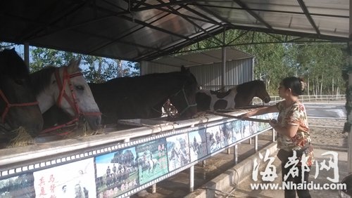 昨日下午,记者来到武陵农场马术场。记者看到,圈里共有九匹马,前面是饲料槽,饲料槽旁的地上有一些干草。游客可将手伸入喂马,马儿的头也可以自由伸缩,并没有网格保护。工作人员介绍,这些都是蒙古马,“我们都是用铲子铲草进饲料槽,用手喂很危险”。