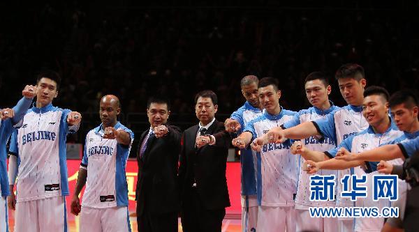 11月1日,北京首钢队成员展示上赛季总冠军戒指。当日,在2014/2015赛季中国男子篮球职业联赛(CBA)揭幕战中,北京首钢队主场迎战广东东莞银行队。 新华社记者白雪飞摄
