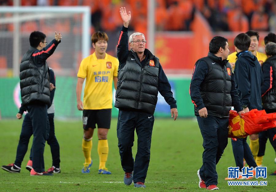 11月2日,广州恒大队主教练里皮(中)赛后向观众挥手。当日,在率队夺得中超联赛冠军后,广州恒大主教练里皮表示:“这是作为主教练执教恒大队的最后一场比赛”。 新华社记者朱峥摄
