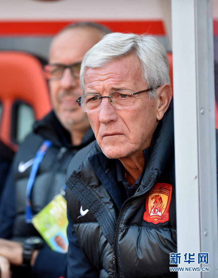 11月2日,广州恒大队主教练里皮在教练席。当日,在2014年中国足球超级联赛第30轮比赛中,广州恒大队客场以1比1战平山东鲁能队,夺得本赛季中超联赛冠军。 新华社记者徐速绘摄