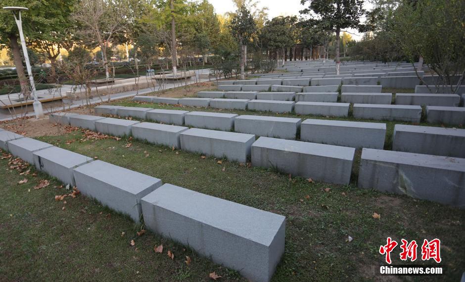 11月3日,河南郑州市区商都路与商鼎路之间的绿化带中,被指酷似“无名墓地”的大理石条。这里马路边的绿化带,幽暗的松柏丛中陈列着一块块灰色的大理石条和巨石块,每块石条相隔1米左右,一排排、一队队整齐地排列。据郑州市环道绿化管理处一名工作人员介绍,这些石条为城市绿化景观石,由一家园林公司提供。杨正华 摄