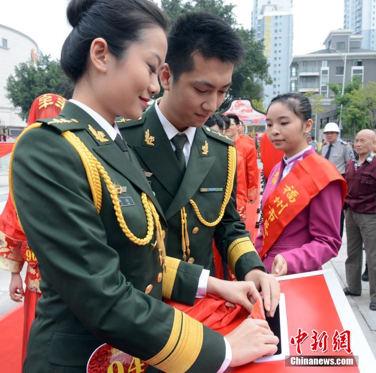 11月3日,主题为“建有福之州,做有福之人”的2014年新福州人集体婚礼在福州工人文化宫举行。参加今年集体婚礼的100对新人,分别来自黑龙江、吉林、湖南、安徽、四川、重庆等20个省、自治区。他们中有博士、硕士,也有刚毕业的大学生;有的是质检员,有的是大学讲师,还不乏工程师、律师、企业白领人士。其中,有6对是少数民族职工,婚礼当天他们也都穿上了自己民族的婚礼服饰,迎接集体婚礼的到来。图为参加该集体婚礼的一对军营伉俪婚礼现场捐款献爱心。中新社发 刘可耕 摄