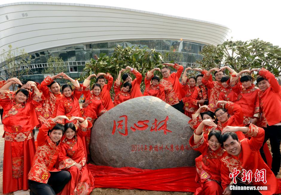 11月3日,主题为“建有福之州,做有福之人”的2014年新福州人集体婚礼在福州工人文化宫举行。参加今年集体婚礼的100对新人,分别来自黑龙江、吉林、湖南、安徽、四川、重庆等20个省、自治区。他们中有博士、硕士,也有刚毕业的大学生;有的是质检员,有的是大学讲师,还不乏工程师、律师、企业白领人士。其中,有6对是少数民族职工,婚礼当天他们也都穿上了自己民族的婚礼服饰,迎接集体婚礼的到来。图为参加该集体婚礼的百对新人在新落成的首届全国青年运动会比赛场馆福州海峡奥体中心外,共植同心树并合影。中新社发 刘可耕 摄