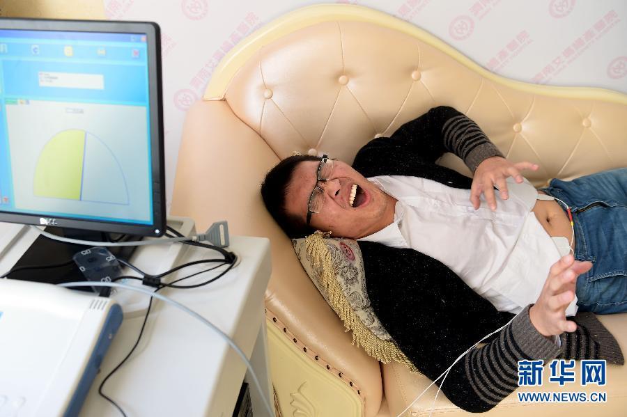 11月3日,在济南艾玛妇产医院,一位志愿者在体验模拟分娩的阵痛。当日,“感恩母爱——分娩阵痛体验”活动在济南艾玛妇产医院举行,志愿者在医护人员的指导下进行“分娩痛楚”极限体验。 新华社记者 郭绪雷摄 图片来源:新华网