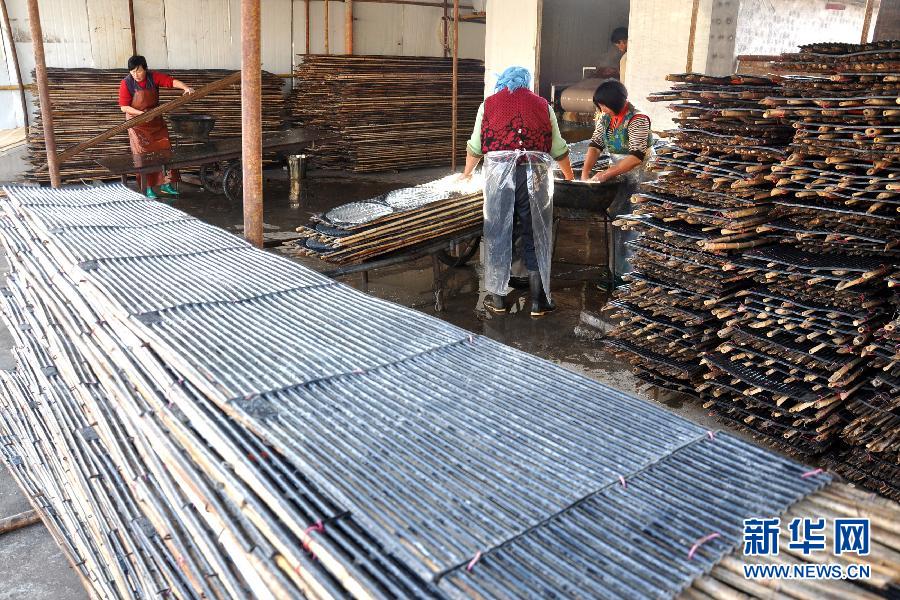 11月4日,山东省沂源县鲁村镇泉子官庄农产品有限公司的工人在加工粉皮。深秋时节,山东省沂源县粉制品加工企业加紧用新地瓜加工粉条、粉皮等粉制品,供应各地市场。近年来,山东省沂源县的一些小微企业利用本地资源,用地瓜加工手工粉皮、粉条等粉制品,以工厂化生产、企业化运作的模式,把粉制品加工做成“大产业”。目前,该县从事粉制品加工的小微企业达到100余家,从业人员达到2000余人,所加工的各类粉制品远销全国各地。新华社发(赵东山 摄)