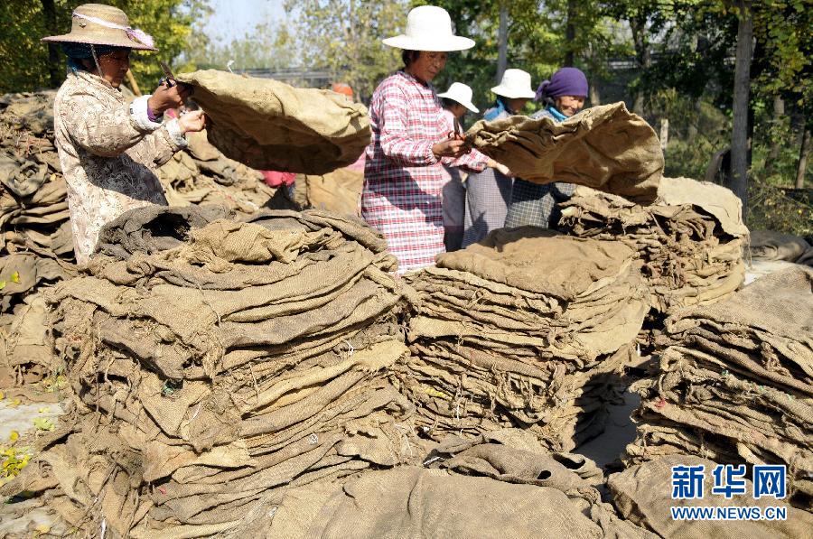 11月4日,山东省临沂市郯城县马头镇房一村农民在分拣废旧麻袋。农闲时节,山东省临沂市郯城县农民把从河南、安徽、江苏等地粮库、港口购来的废旧麻袋加工成麻盘、麻垫、毡片等麻制品,变废为宝销往全国各地。当地农商行开通“小微企业贷款绿色通道”,贷款扶持麻制品加工合作社。目前,该县有7个专业村上万名农民从事废旧麻袋加工业,年加工麻制品700多万件(套),从业农民月均增收4000余元。新华社发(房德华 摄)