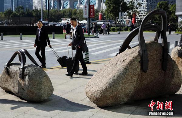 11月4日,上海街头的几款巨型“石包”吸引了不少路人的眼球。时下,充满创意的街头雕塑已成为申城一道靓丽的风景。