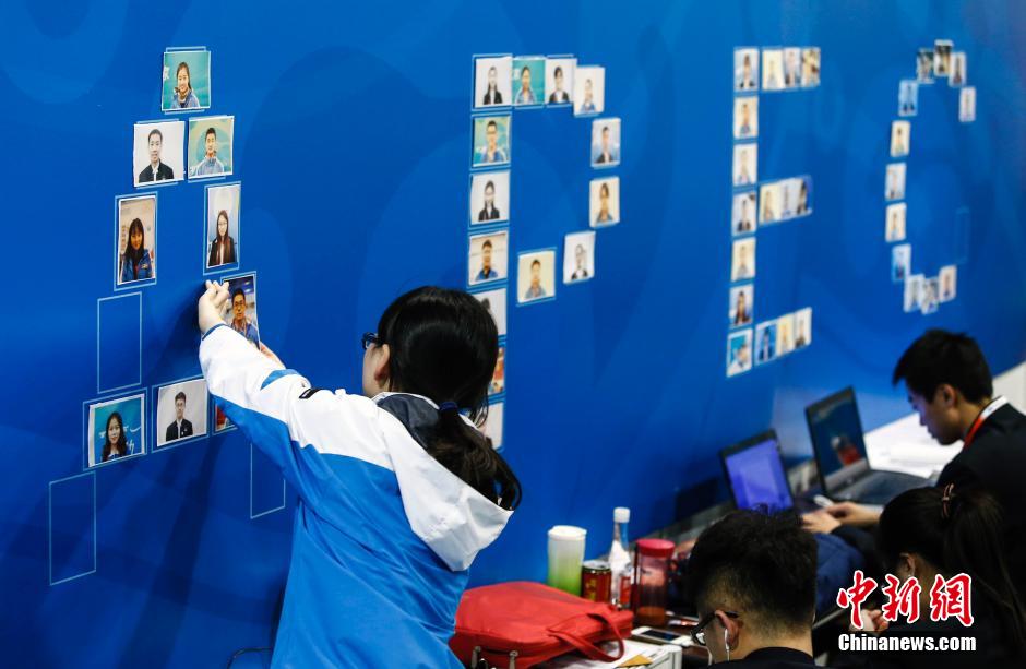 11月5日,2014年亚太经合组织(简称APEC)最后一次高官会在北京国家会议中心举行,拉开了今年APEC领导人会议周的大幕。北京各大高校的志愿者也开始进入了繁忙的工作状态,图为一名志愿者在国家会议中心的志愿者之家将同学的笑脸拼成APEC字样。中新社发 张浩 摄
