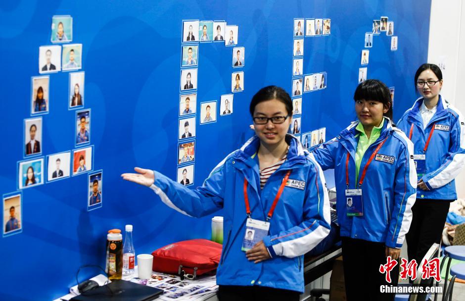 11月5日,2014年亚太经合组织(简称APEC)最后一次高官会在北京国家会议中心举行,拉开了今年APEC领导人会议周的大幕。北京各大高校的志愿者也开始进入了繁忙的工作状态,图为三名志愿者在国家会议中心的志愿者之家和同学笑脸拼成的APEC字样合影。中新社发 张浩 摄