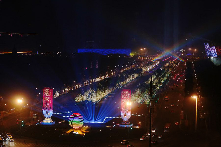 10月底奥林匹克景观大道南端布置的会徽灯光。图片来源:千龙网