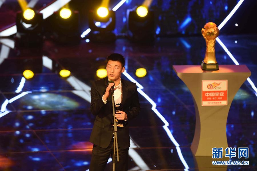 11月6日,上海上港队球员武磊在颁奖典礼上。 当日,2014中超联赛年度颁奖典礼在北京清华大学举行,武磊获得最佳本土射手奖。新华社记者郭勇摄