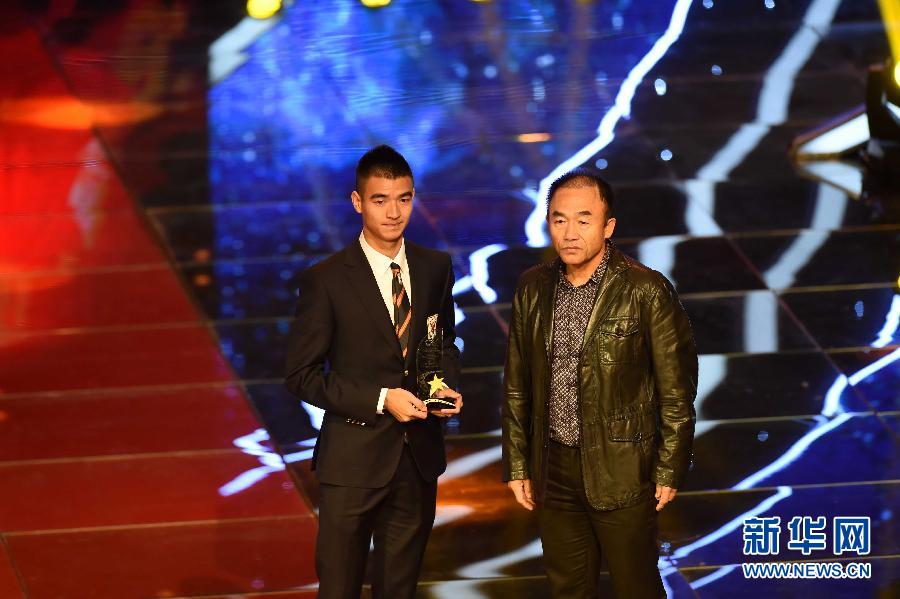 11月6日,山东鲁能队球员刘彬彬(左)在颁奖典礼上。 当日,2014中超联赛年度颁奖典礼在北京清华大学举行,刘彬彬获得最佳新人奖。新华社记者郭勇摄