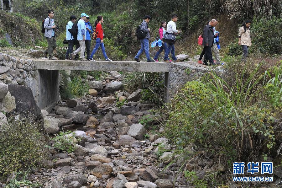 11月6日,参加体验活动的志愿者和村民代表从江西资溪县马头山镇山岭村第176号爱心便民桥上走过。