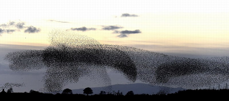 成群结队的椋鸟向来以在空中变换队形、摆出不同形状而闻名(网页截图)