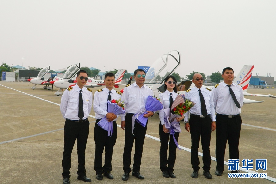 11月6日,山河飞行表演队高明、彭兴福、侯珉、杨思洁、林宏、魏天飞抵珠海后在停机坪合影。新华社发