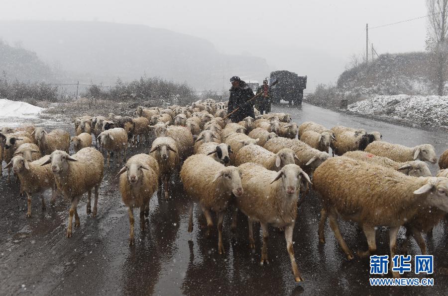 11月7日,在山西省晋中市寿阳县,两名村民在雪中赶着羊群回家。当日是农历二十四节气中的“立冬”,山西省晋中市迎来一场降雪。 新华社记者 燕雁 摄