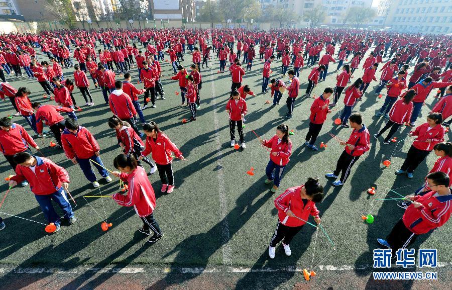 11月7日,呼和浩特市回民中学的学生在课间操上抖空竹。为增强学生体质,丰富校园文化生活,2011年起,内蒙古呼和浩特市回民中学将抖空竹作为特色体育教育课目引入学校课间操。经过几年的学习和锻炼,学生们不仅掌握了常规的抖空竹技巧,还学会了“挂红灯”“海底捞月”“鸡上架”“满天飞”等特色动作。抖空竹已经成为回民中学的体育教学特色,每到课间操时间,轻松的乐曲伴着空竹发出的鸣声在操场上回荡。新华社发(王正 摄)