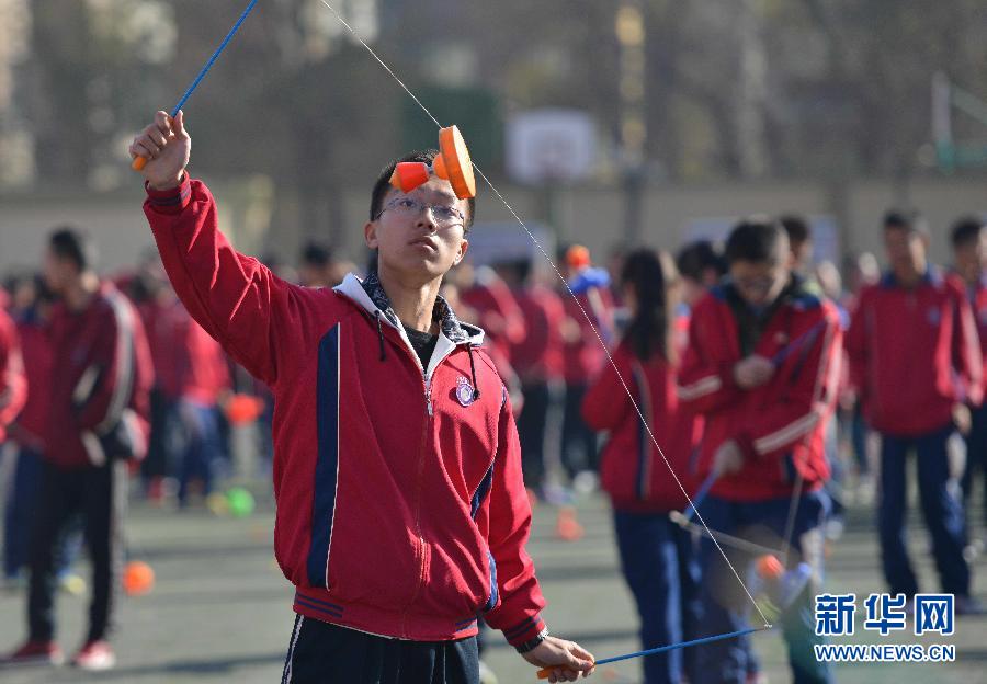 11月7日,呼和浩特市回民中学的学生在课间操上抖空竹。为增强学生体质,丰富校园文化生活,2011年起,内蒙古呼和浩特市回民中学将抖空竹作为特色体育教育课目引入学校课间操。经过几年的学习和锻炼,学生们不仅掌握了常规的抖空竹技巧,还学会了“挂红灯”“海底捞月”“鸡上架”“满天飞”等特色动作。抖空竹已经成为回民中学的体育教学特色,每到课间操时间,轻松的乐曲伴着空竹发出的鸣声在操场上回荡。新华社发(王正 摄)