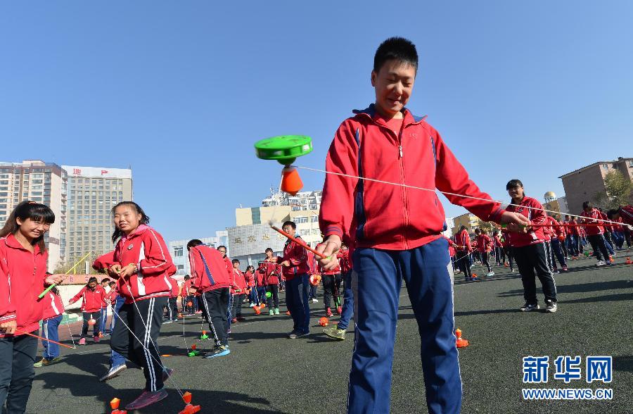 11月7日,呼和浩特市回民中学的学生在课间操上抖空竹。为增强学生体质,丰富校园文化生活,2011年起,内蒙古呼和浩特市回民中学将抖空竹作为特色体育教育课目引入学校课间操。经过几年的学习和锻炼,学生们不仅掌握了常规的抖空竹技巧,还学会了“挂红灯”“海底捞月”“鸡上架”“满天飞”等特色动作。抖空竹已经成为回民中学的体育教学特色,每到课间操时间,轻松的乐曲伴着空竹发出的鸣声在操场上回荡。新华社发(王正 摄)