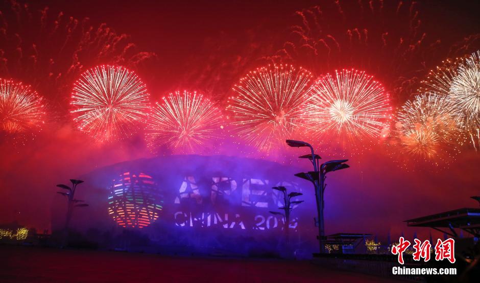 11月10日晚,北京在奥林匹克公园举行焰火表演。APEC领导人观看了焰火表演。 中新社发 张浩 摄