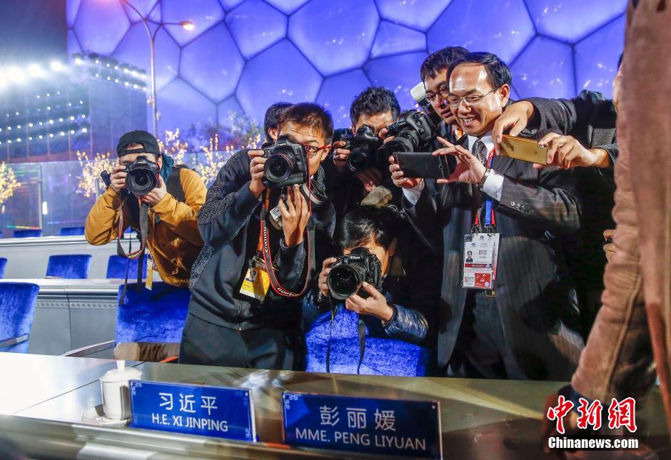 11月10日晚,北京在奥林匹克公园举行焰火表演。APEC领导人观看了焰火表演。图为记者争相拍摄桌牌。中新社发 张浩 摄
